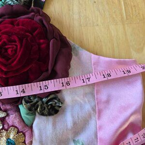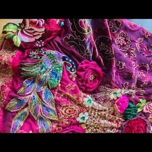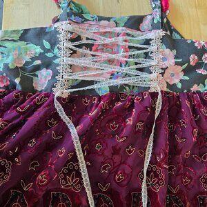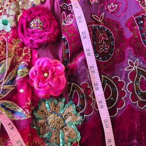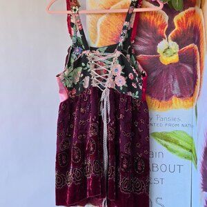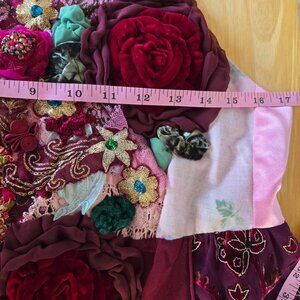 Handmade blouse featuring an empire waistline and adjustable lace-up back. Showcases hand-stitched velvet roses and vintage collected materials in an ornate design. Perfect for special occasions or events where you want to stand out. Pairs beautifully with black leggings or a burgundy midi skirt. One-of-a-kind construction means no two are alike.
