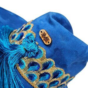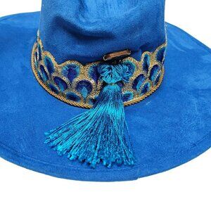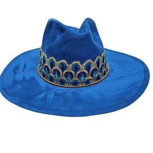 Peacock Royal Blue Velvet Cowboy Wide Brim Hat Tassel Embroidered Ribbon Band M