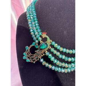 Bring a touch of elegance and bold beauty to your collection with this stunning peacock statement necklace. Featuring three strands of shimmering teal crystal glass beads, this piece is highlighted by a detailed gold-tone peacock centerpiece with jewel accents. The design captures the grace and regality of the peacock—symbolizing beauty, confidence, and renewal.