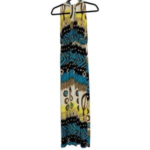 Peacock Stretchy V Neck Floor Length Maxi Dress Blue and Yellow Medium