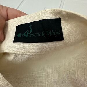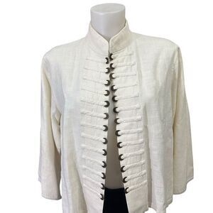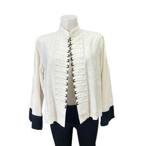 Peacock Ways Cream Black Trim Linen Mandarin Collar Open Blazer Coin sz L VTG