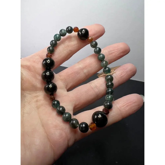 This is a new bracelet made by The Purring Buddhas. Strung on a durable stretch cord to fit a 8 inch wrist. Stones are 6 mm peacock kyanite , faceted Hessonite garnet , and 5 jet beads in a 10 mm size.