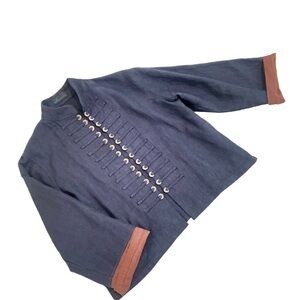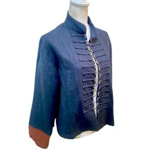 Peacock Ways is a quality boutique brand. The linen is gorgeous and substantial. Navy open front jacket with coin military detailing front. Cuffs of each sleeve is a contrast caramel color. Euc