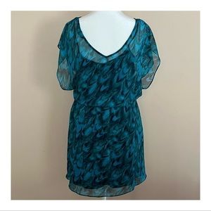 This is SUCH a beautiful dress for any special occasion!! Gorgeous peacock-blue colors and feather-like pattern throughout. Dress is fully lined with an elastic waist and v-neck in front and back. 100% polyester (shell and lining). Express size small. This is a very flattering dress and pairs great with a pair of nude pumps or sandals. Worn once or twice, in excellent condition. Search 'express' in my closet for more styles!!