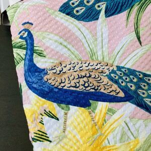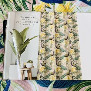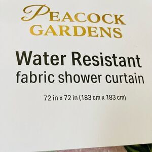 NWT gorgeous botanical peacock floral print fabric shower curtain set. Blue and green color tones with yellow flowers on a light pastel rose pink background. Water resistant.