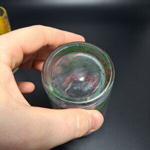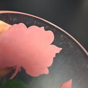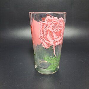 This vintage drinking glass showcases a charming pink rose design with green leaves. Suitable for collectors or as a unique addition to your glassware collection.