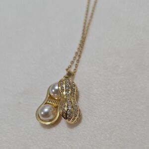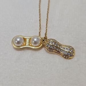 This adorable necklace features a unique stainless steel peanut-shaped pendant adorned with sparkling crystals and lustrous faux pearls.