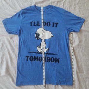 This is a blue short-sleeved t-shirt with a graphic of Snoopy from the Peanuts cartoon strip on the front. In black letters above and below the graphic are the words, "I'll Do It Tomorrow".