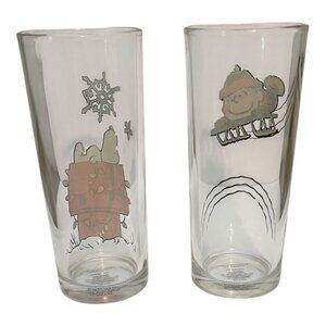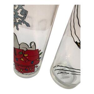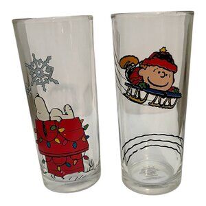 These Peanuts Christmas glasses showcase beloved characters Charlie Brown and Snoopy in festive scenes. Perfect for adding a touch of nostalgia and charm to any holiday gathering, these glasses are ideal for collectors and fans of the classic comic strip. Theres a couple of scratches on the Snoopy glass see photos.