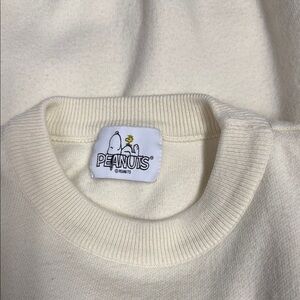 This Peanuts sweater in a soft cream color features a classic crew neck design, offering a timeless and versatile style. The medium-weight knit texture and ribbed cuffs make it perfect for cooler weather, providing both comfort and warmth.