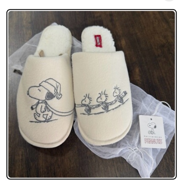 Soft cream slippers with Snoopy and Woodstock design. Sold by Pottery Barn.