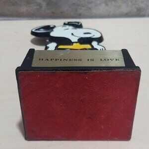 Features Snoopy, the beloved beagle from the Peanuts comic strip. The base of the trophy reads "HAPPINESS IS LOVE".