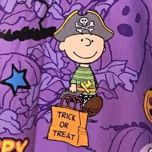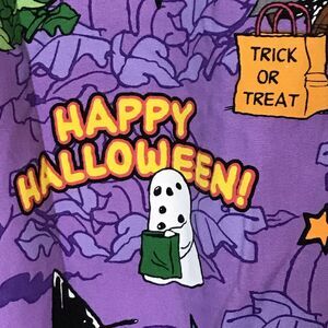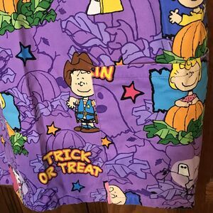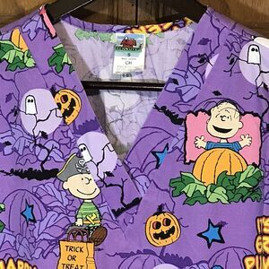 Peanuts It's the Great Pumpkin Charlie Brown Halloween Top. Women's size Small, 55% Polyester - 35% Cotton, Purple Multicolor, V-Neck, Short Sleeves, 2 Pockets Scrubs. The whole Peanuts gang, with Pumpkins, Ghosts and Pig Pen. Trick or Treat Scrubs for Nurse, Vet, Dental, Medical.