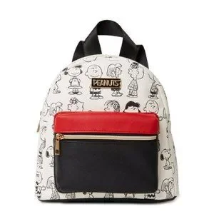 This faux leather bag features two zipper pockets for easy organization. The front panel and side gussets of the bag are covered with your favorite Peanuts characters, including Snoopy, Charlie Brown, Peppermint Patty and more! Finished with Golden zippers and the Peanuts logo on the front.