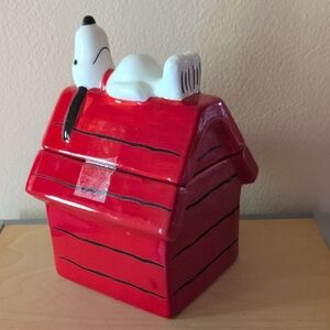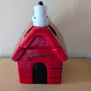 Charming storage container shaped like Snoopy's doghouse. Features Snoopy on the roof. Perfect for organizing small items.