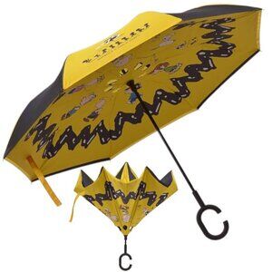 Have fun in the rain! Large 42.5" size. his brand- new with tags attached Peanuts Revers-A-Brella keeps the water from getting all over the floor or car when coming indoors out of a pouring rain. The Revers-A-Brella is a unique umbrella designed to close upwards, trapping raindrops inside its water-repellant canopy. It features a 75th-anniversary design celebrating the Peanuts gang, adding a nostalgic charm to its functionality. The umbrella is made from durable double-layer pongee fabric, is wind-resistant up to 38 mph, and includes a hands-free C-handle for easy use. Just carry with your wrist when not in use. It is perfect for those who appreciate quality and a touch of whimsy in their everyday accessories.