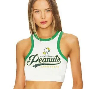 This Peanuts Ringer features Snoopy in style on a white base with bold green trim. 100% Cotton Condition: New
