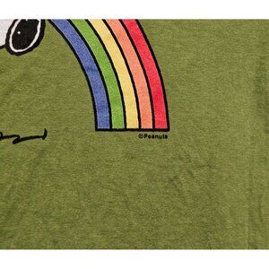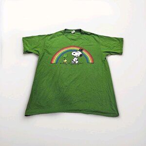 This Peanuts Snoopy and Woodstock Irish Pot of Gold T-shirt in size Large is perfect for St. Patrick's Day. The green shirt features a crew neck and short sleeves, made from a comfortable cotton blend material. The shirt showcases the beloved Snoopy character and Woodstock from the Peanuts franchise, adding a fun and festive touch to your wardrobe. The design is great for wearing in the summer, fall, or spring seasons, making it a versatile piece for any man's collection. Measurements in photos.  Pre-owned in very good condition