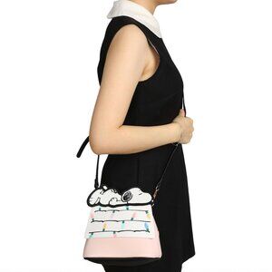 Featuring charming artwork of a applique Snoopy lounging atop his iconic white dog house wrapped in colorful Christmas lights, this pink bag is the perfect blend of festive fun and nostalgic charm.