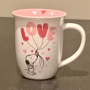 This is a beautiful 16oz ceramic mug from the Peanuts Valentine’s Day Collection. Gorgeous colors with adorable design featuring holding balloons that spell out Love. Pink and red heart accents. Solid pink interior with three multi colored hearts on the interior lip. Brand new and in excellent condition. Comes from a smoke free home.