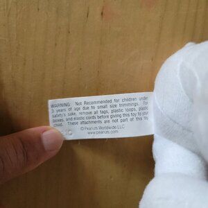 Cuddly Peanuts Snoopy plush adorned with a festive holiday hat and scarf. Ideal for collectors and fans of the classic comic strip.