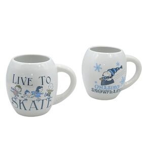 Peanuts Snoopy Set Of 2 Ceramic Coffee Mugs Double Sided Winter Themed Design18oz Chasing Snowflakes And Live To Skate Dish Themed Design