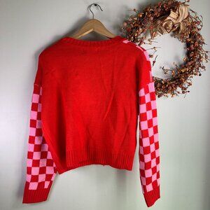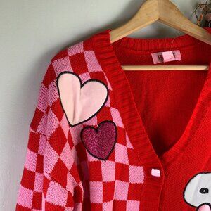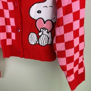 Peanuts Snoopy Valentine's Day Cardigan Sweater V-Neck SMALL Red Checker