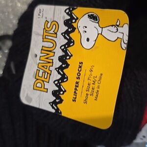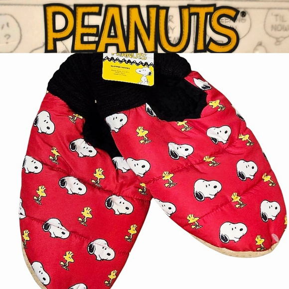 Red slippers with Snoopy and Woodstock design. Comfortable and stylish.