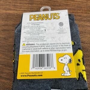 Gray crew socks with Peanuts character design. Features bright yellow accents of Woodstock