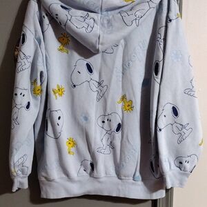 Peanuts hoodie featuring Snoopy and Woodstock This Adorable Light blue and yellow design is very playful. Ideal for comfort and style. The size is extra large, armpit to armpit measures 24 inches, shoulder to waist measures 27 inches, used lightly worn, in good condition no rips,no stains or tears, smoke-free home and pet free home. Make me an Offer