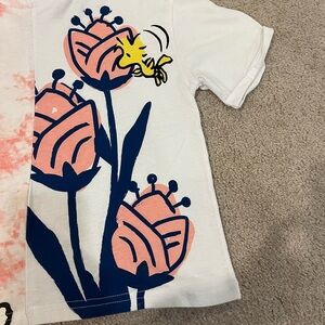 In good shape! Split design graphic tee featuring snoopy and Woodstock! Fit is slightly cropped! Tie dye and bright colors! Perfect for any Peanuts or Charlie Brown lover! Offers always welcome!