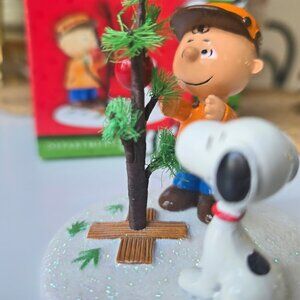 Join Charlie Brown and Snoopy as they lovingly decorate their tiny tree, capturing the heartwarming essence of holiday joy and simple pleasures. Made by Dept 56 for Peanuts Village. Glittered snow effect base adds to the winter scene.