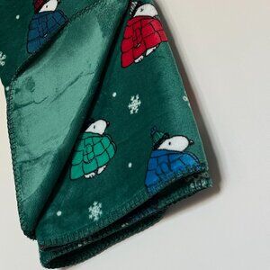 Green Puffer Jacket Snoopy Blanket – Showcases Snoopy bundled up in his adorable puffer jacket alongside Woodstock, set against a dark green background with snowflakes. Cozy, playful, and full of seasonal charm. Reverse side is solid green.