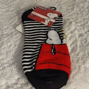 These New with tags black and white striped Peanuts Snoopy and Woodstock no shows socks fits a shoe size 4-10. 98% polyester 2% spandex and machine washable. All offers are welcome.