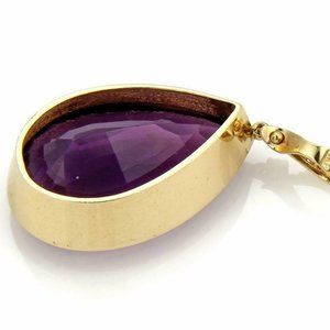 This large impressive pendant is crafted from 14k yellow gold with a polished finish. The pear shape frame has a large 35 carats pear shape amethyst gemstone. The clip bail is decorated with 9 points diamond with the metal stamp 14k.