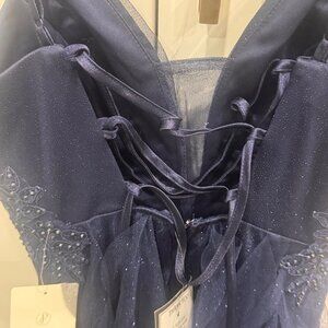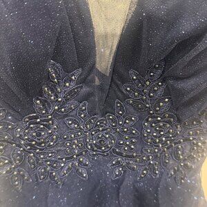 Pear Culture Navy Blue Beaded Tulle Mini Dress Size 0 with Ruffled Skirt & Adjus