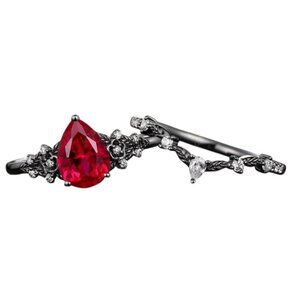Absolutely gorgeous 2 piece bridal and engagement ring set!! Pear Cut Lab Red Ruby set in Rhodium with Moissanite side stones. Each ring is in itself gorgeous but put them together and WOW! Come in ring boxes.
