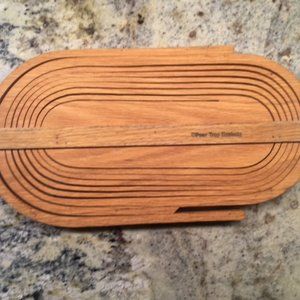 Stamped "Pear Tree Baskets", this collapsible, accordian-type wooden basket stores flat and opens with a deep basket. Made of natural wood, a honey oak color, and in good/excellent condition. No chips or dents. 14" long; 7.5" wide; 1" deep when closed. When opened, the basket is 3 3/4" deep. Not signed.