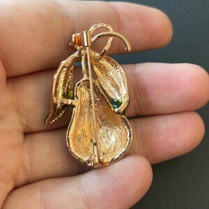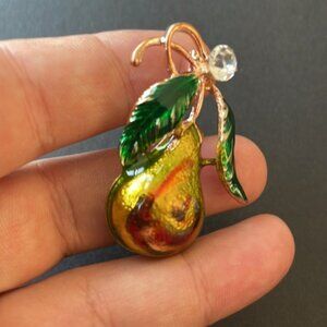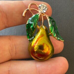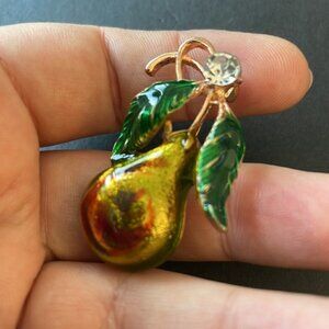 Pear ๐Ÿ brooch pin hand painted Green leaves ๐Ÿƒ enamel hand painted Gold tone details