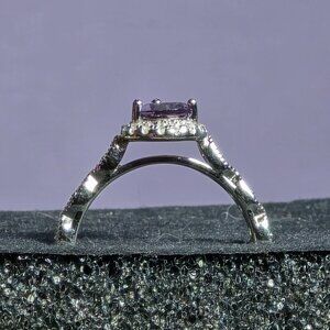 This exquisite ring features a pear-cut synthetic alexandrite surrounded by sparkling cubic zirconia accents. The sterling silver band adds timeless elegance to any June birthday girl's collection.