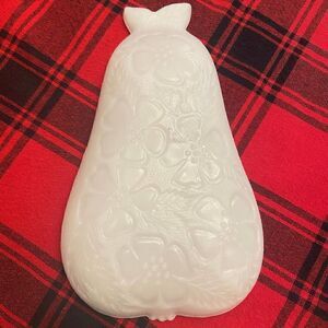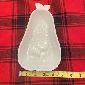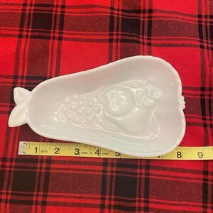 Inside of dishes has grapes, apples, pears and cherries. Outside of dishes have a floral pattern.
