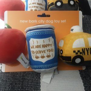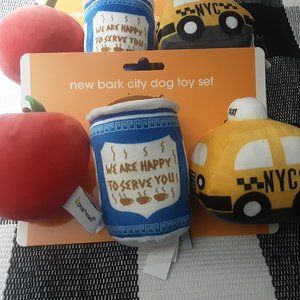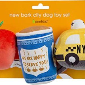Includes three plush squeaker dog toys: one apple, one yellow taxi cab, and one coffee