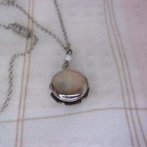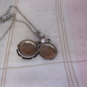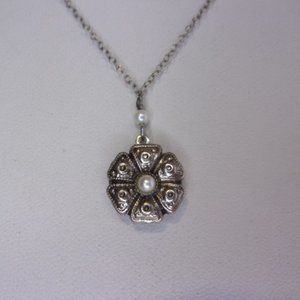 Silver tone floret locket with faux pearl center on 15" long chain, has barrel clasp, unknown maker, nice condition, very sweet.