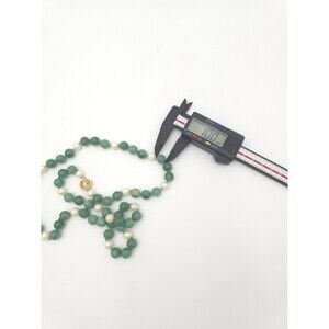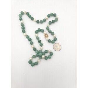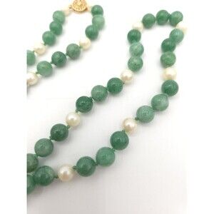 Hand knotted green aventurine beaded necklace accented with pearls. Gold tone box clasp. Measures approximately 26". Very good pre-owned condition. Please see pictures.