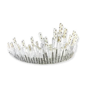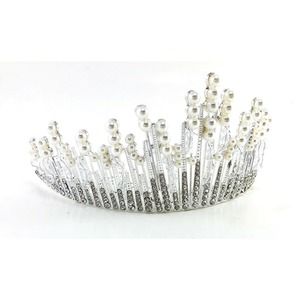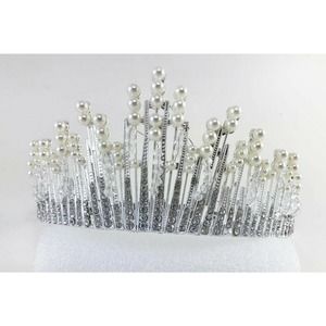 Pearl Bead Clear Silver Tone Metal Tiara Crown Bridal Elegant Rhinestone