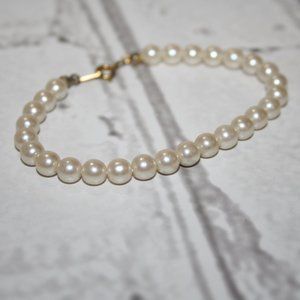 This classic bracelet features creamy faux pearls in a 7.5" strand with a secure clasped fit—no stretch, just vintage polish. Its soft shimmer and traditional styling make it perfect for bridal bundles, grayscale drops, or romantic edits.