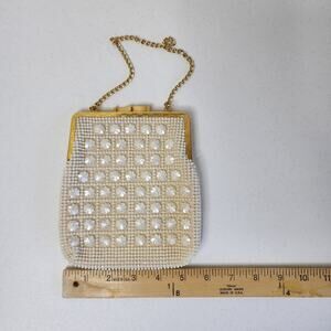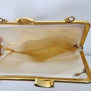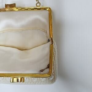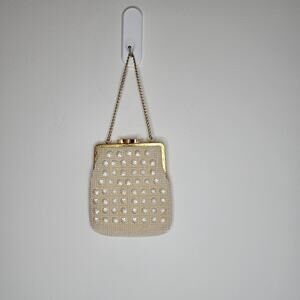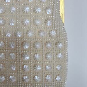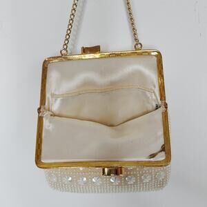 Pre-owned evening bag embellished with pearl beads and flower beads with gold chain and snap closure. Missing beads(noticed one on one side and two on the other side), as seen in the first and second picture.