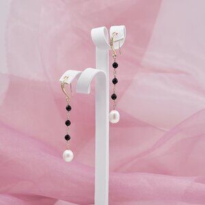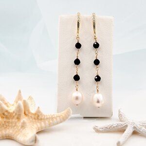 These exquisite handmade earrings feature a striking contrast of lustrous white pearls and deep black spinel stones, creating a bold yet sophisticated look.