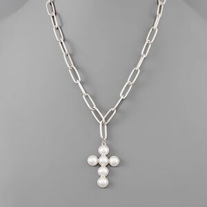 This elegant Pearl Cross & Chain Necklace features lustrous pearls paired with a sleek metal chain. Available in both silver and gold, it boasts a secure lobster clasp and measures 18 inches in length, making it a timeless addition to any jewelry collection.