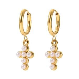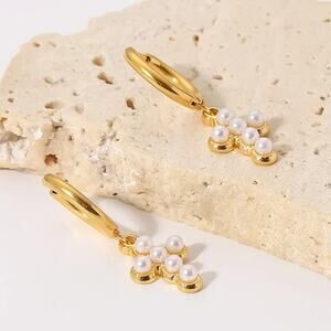 Pearl Cross Dangle Hoop Earrings 18K Gold Plated Stainless Steel